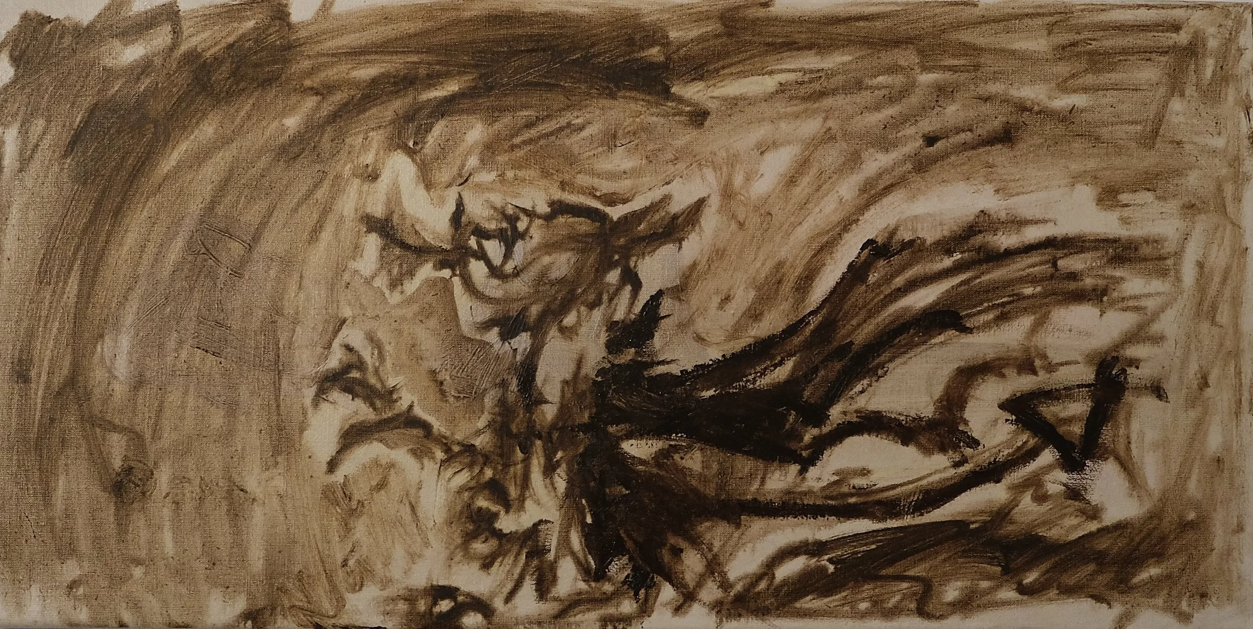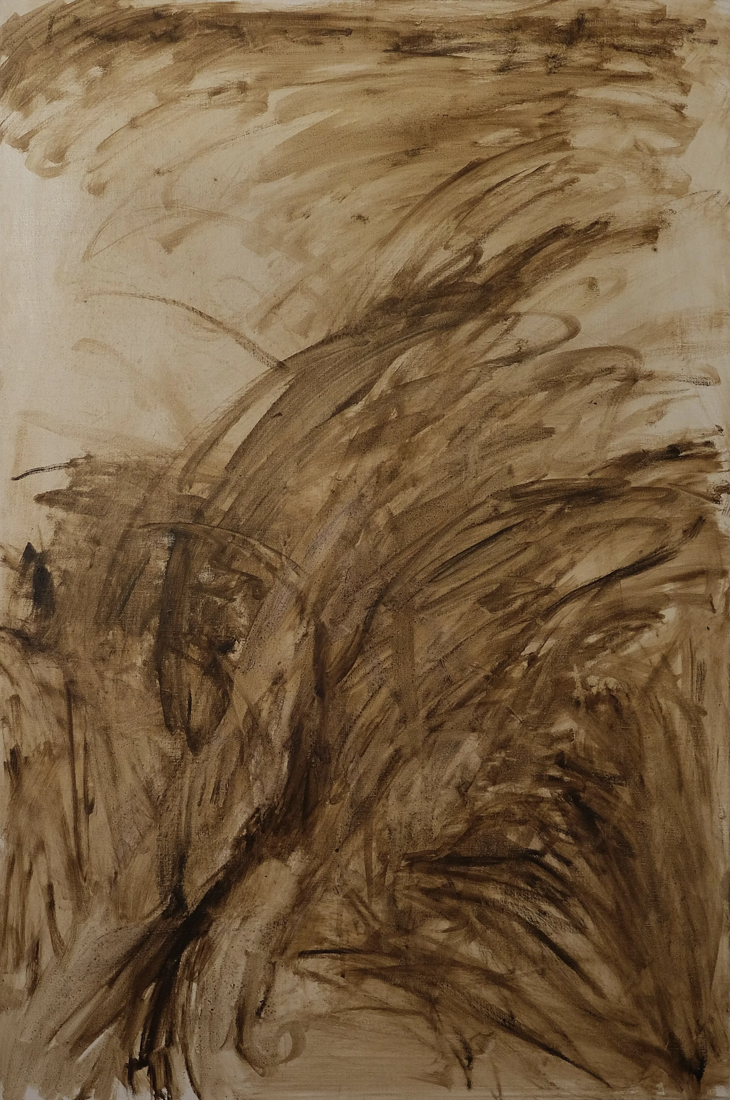 After descending by the light of a headtorch, the artist painted the umbers of sullen Welsh winter, marking an impression of its fitful meteorology and honouring the country’s meandering hills.